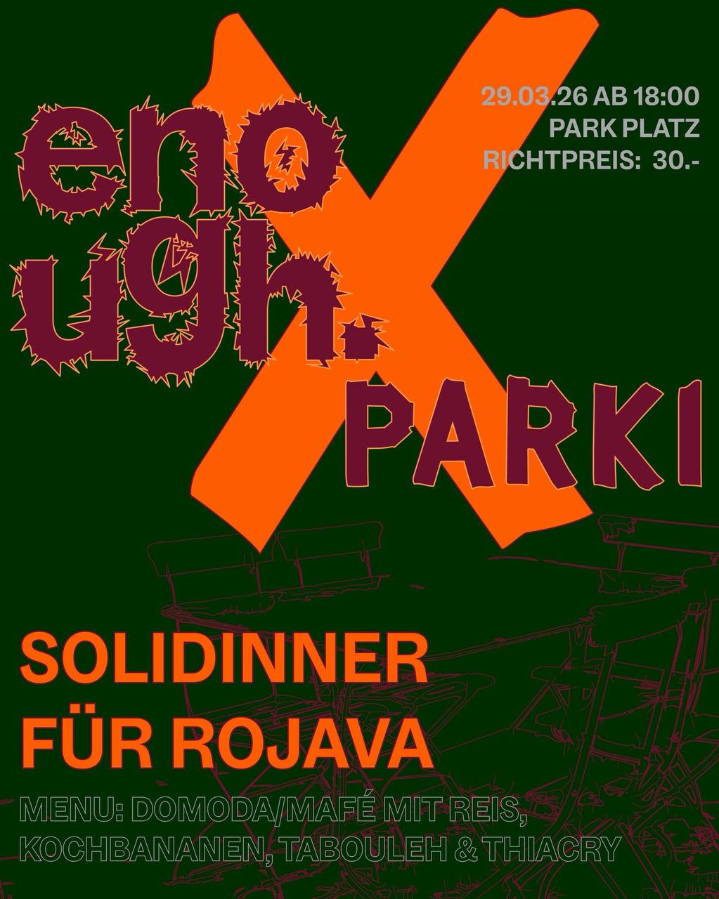 Für das diesmonatiges Zusammenkommen im von enough. im Parki am 29.03. laden wir euch herzlich zu einem Solidinner für Rojava ein. Kommt vorbei und bringt eure Freund*innen mit. Ab 18.00 Uhr gibt es Domoda/Mafé mit Reis, Kochbananen und Tabouleh und zum Dessert Thiacry.