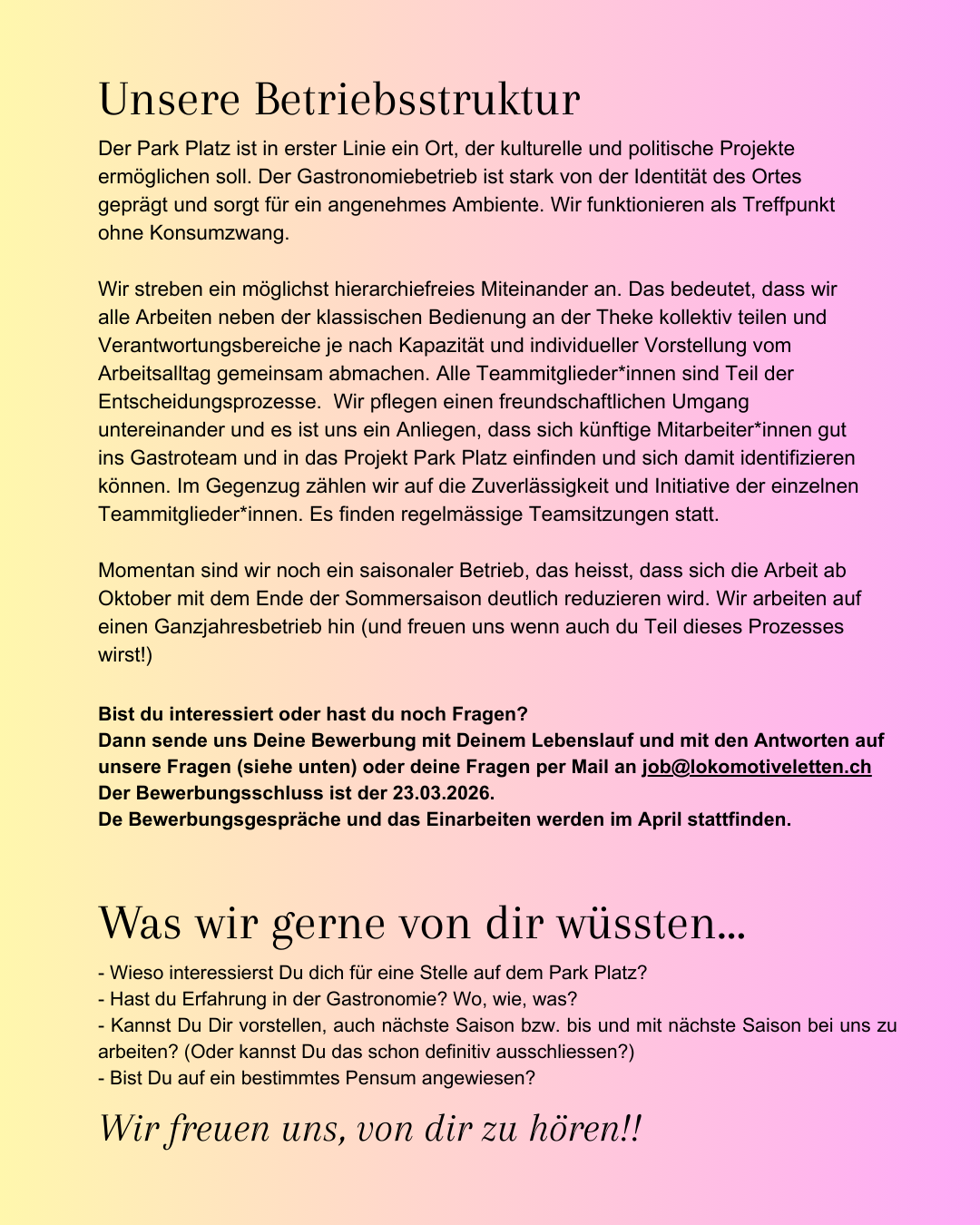Der Bewerbungsschluss ist am 23.03.2026. Wir nehmen Dein Schreiben mit Unterlagen gerne auf job@lokomotiveletten.ch an