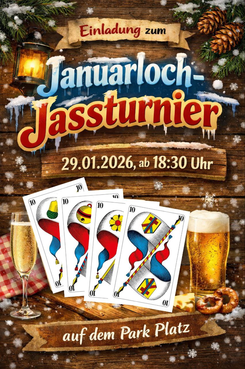 Januarloch Jassturnier 29.01.2026 / 18:30 Uhr Anmeldung fürs monatliche Jassturnier hier: https://forms.gle/BQYhm8pgSSjVR3js8