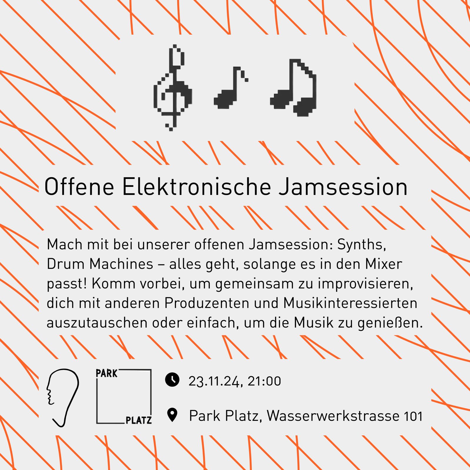 Lust auf einen entspannten Abend mit elektronischer Musik? Dann komm vorbei zu unserer offenen und improvisierten Jam-Session auf dem Parki! Bring dein Gear, Instrumente und deine Freund*innen mit. Lass uns gemeinsam in faszinierende Klangwelten eintauchen.